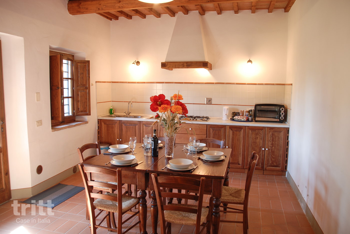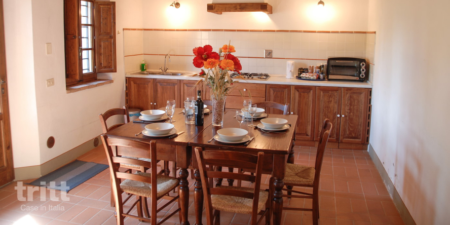 The holiday home for 7 people (6+1) consists of three floors and combines space with typical Tuscan elements. On the ground floor is a large dining area with a long kitchen unit, equipped with a fridge freezer, 4-burner hob, electric mini oven, Italian coffee maker, kettle and a generous dining table. On the first floor there is a spacious living room with sitting area, an extra toilet and access to a large roof terrace. This terrace offers a lot of privacy and a beautiful panoramic view, ideal for long evenings outside. An extra bed can also be placed on this floor.