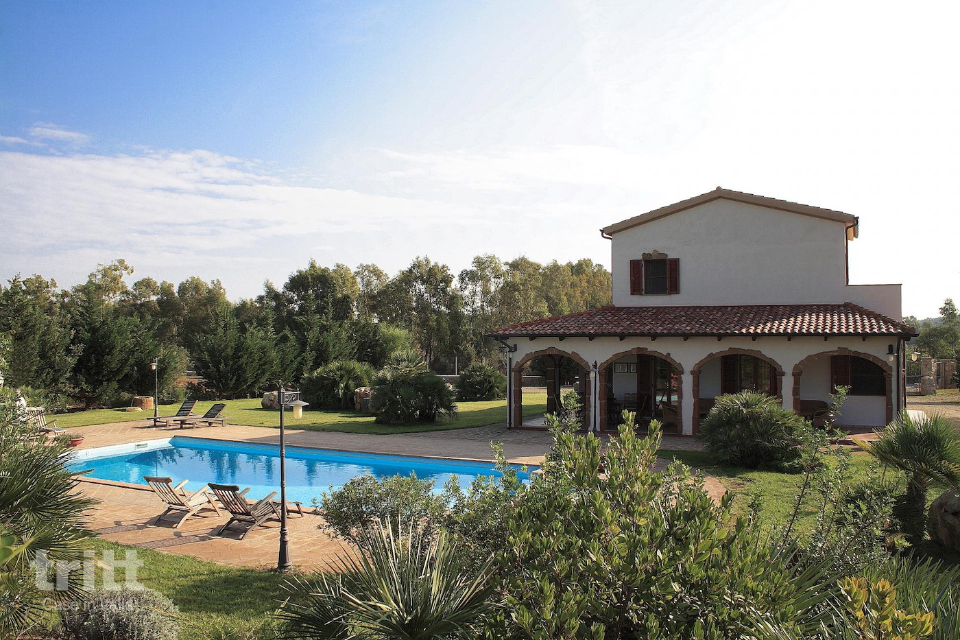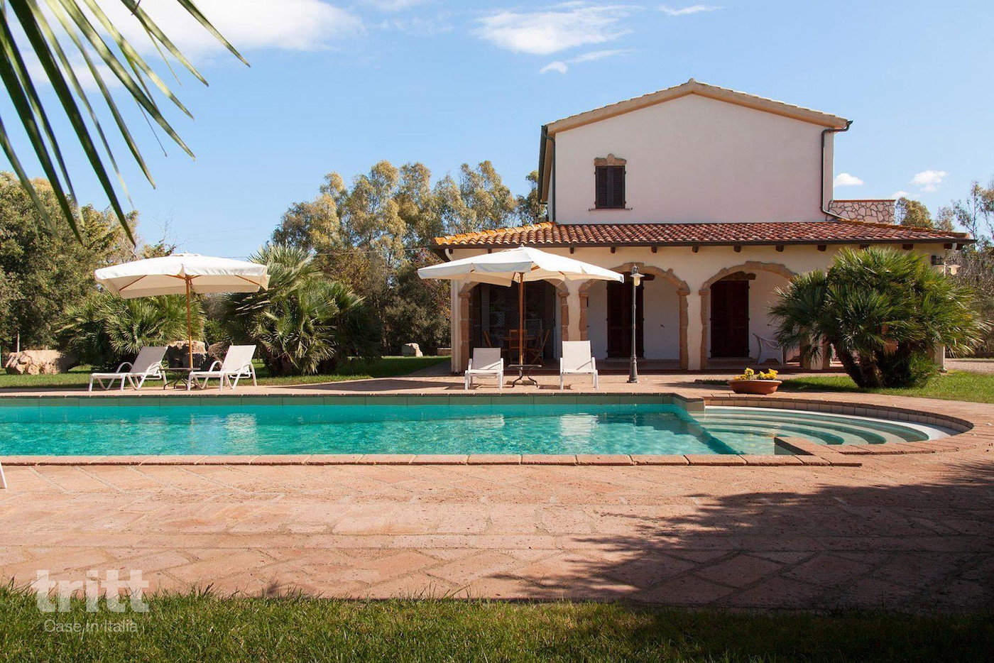 Deze vakantievilla Sardinie heeft twee verdiepingen en beschikt over 5 slaapkamers voor 10 personen en 4 badkamers. Buiten is er een mooi privé zwembad en een veranda met grote buitentafel en een loungeset.