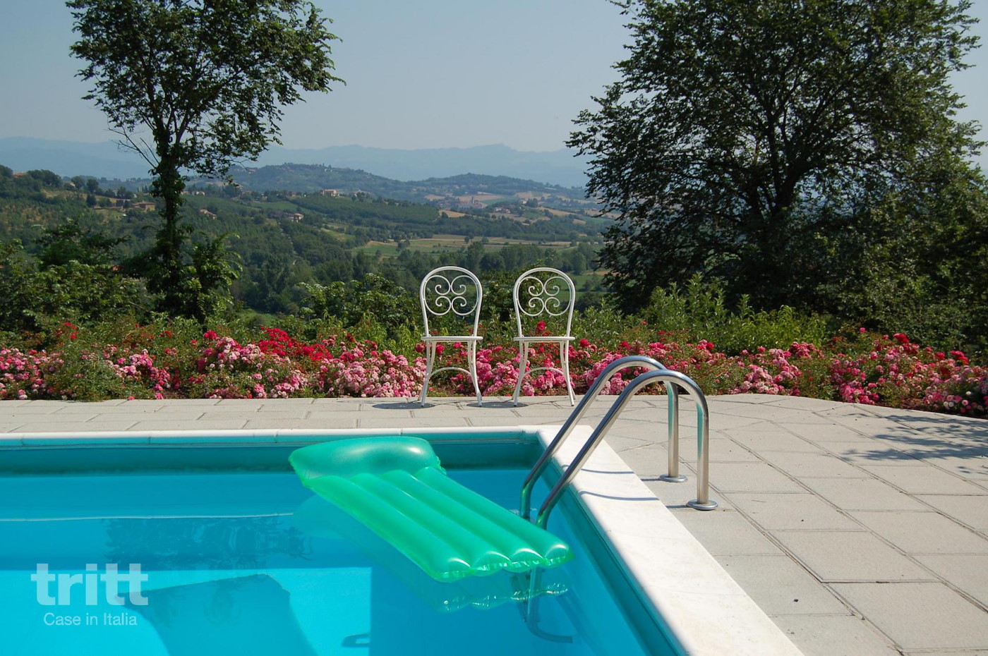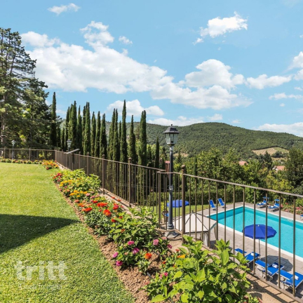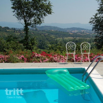 Het zwembad (6 x 12 m) ligt een niveau lager dan de villa. Het zwembad wordt bereikt via een stenen trap. Aan alles is gedacht: ligstoelen met parasols, pergola met tuinmeubilair, een buitendouche en sfeervolle verlichting voor een avondduik. Op aanvraag (€) kan een jacuzzi worden bijgeplaatst. Het prachtige uitzicht over het glooiende Toscaanse landschap maakt het plaatje helemaal compleet.