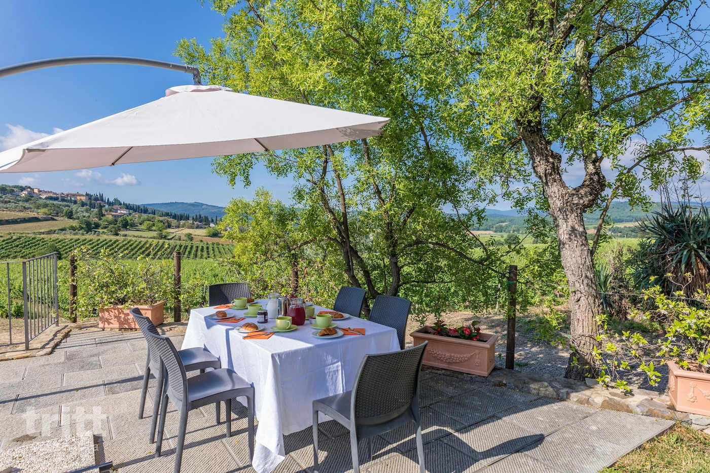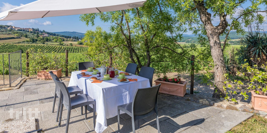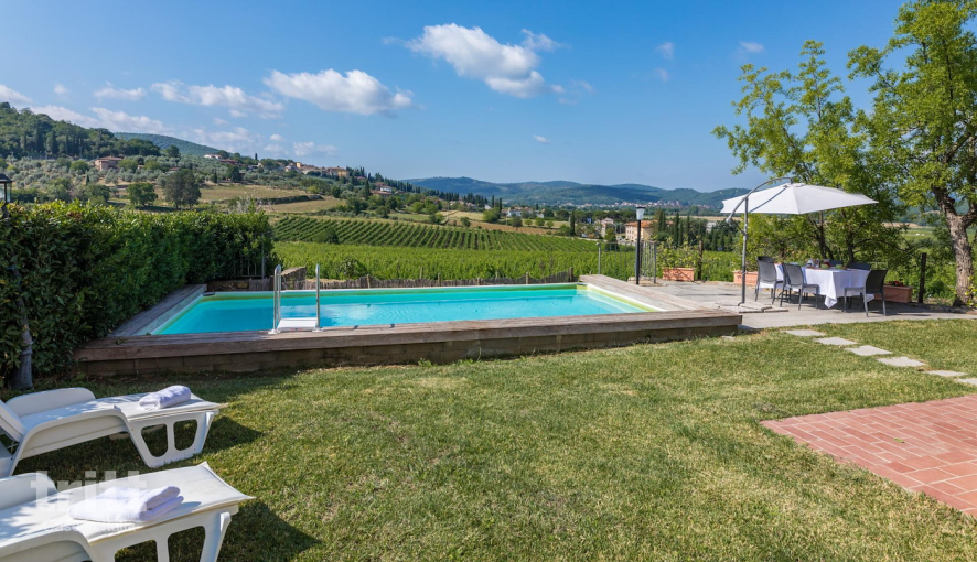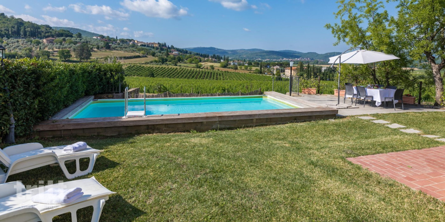 De buitenruimte heeft een terras met tuinmeubilair, privé zwembad met ligstoelen (4x8m), barbecue. Je kunt hier elke dag genieten van een prachtig uitzicht over de wijngaarden. De tuin is niet omheind, je viert hier vakantie op het platteland.