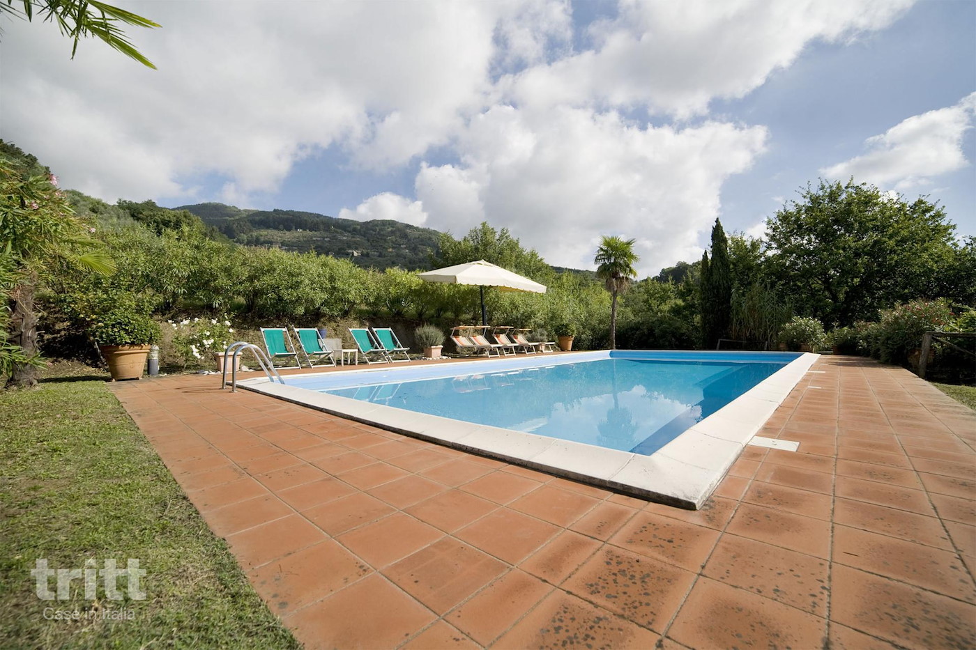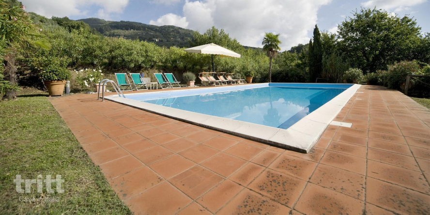 Buiten is er veel ruimte, iets boven het huis op een zonnige plek, ligt het zwembad van 5x12m. Om het zwembad staan ligstoelen, zonnebedden en parasols. Zowel het grote huis als de cottage hebben een pergola met tuinmeubilair. Geniet van het uitzicht richting Lucca en de Monte Pisani heuvels in de verte. (10+1 pers.) Begane grond tuin/dalkant: Volledig ingerichte keuken voorzien van kookplaat, koelkast met vriesvak, vaatwasser, oven, magnetron, koffiezetapparaat; eetgedeelte met eethoek, woonkamer met open haard en gezellige zithoek en deuren naar buiten met toegang tot de tuin en veranda; badkamer met toilet, aparte ruimte met wasmachine.