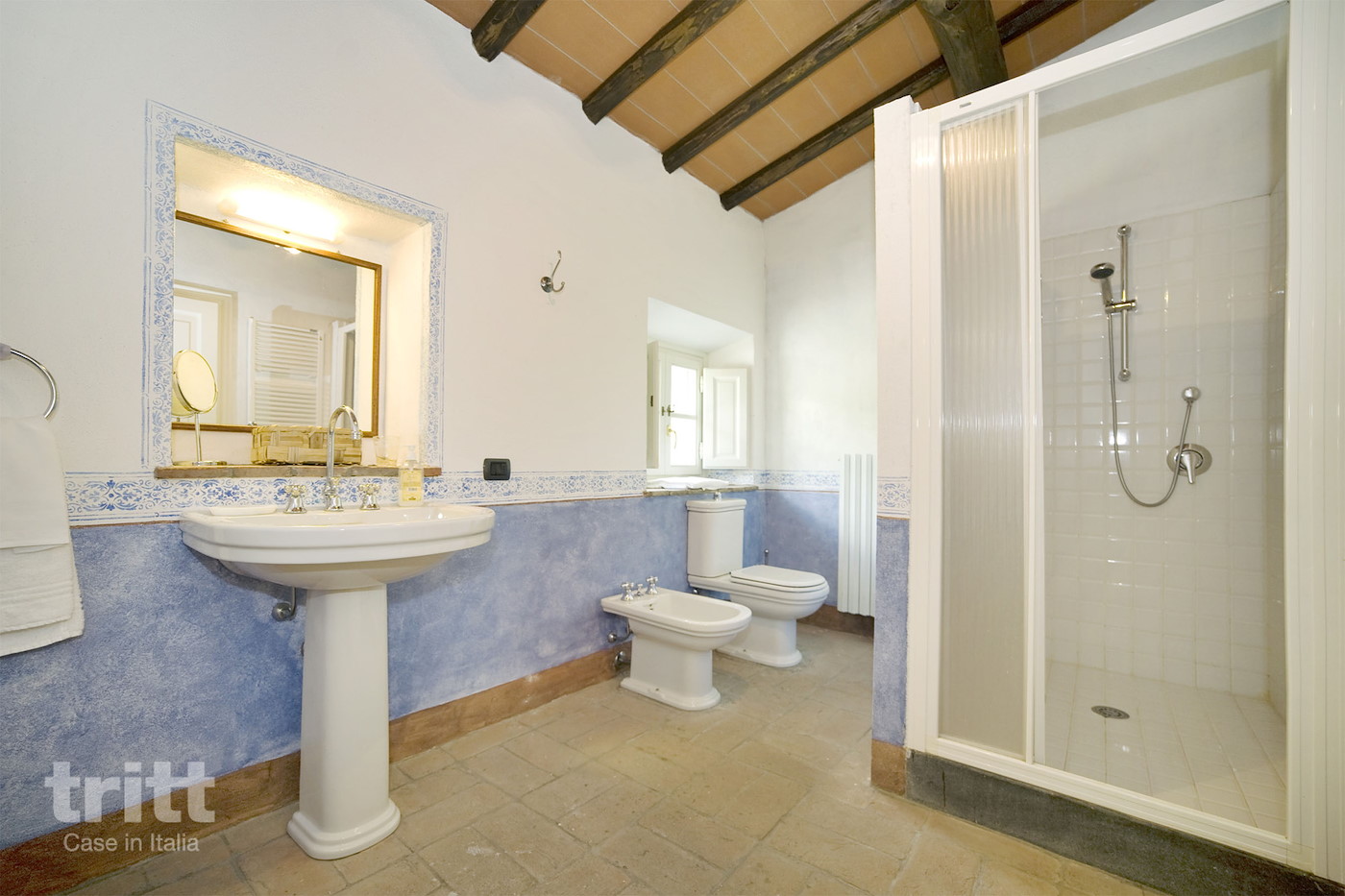 Verdieping: Woonkamer met bank, slaapkamer met tweepersoonsbed(4) met aangrenzende badkamer met bad, douche, wastafel, toilet en bidet; slaapkamer met 2 eenpersoonsbedden(5); badkamer met douche, wastafel, toilet en bidet.