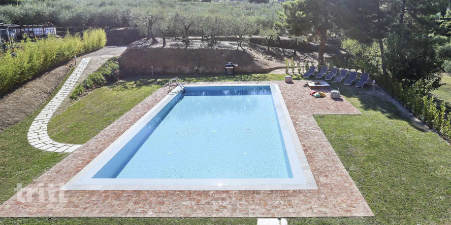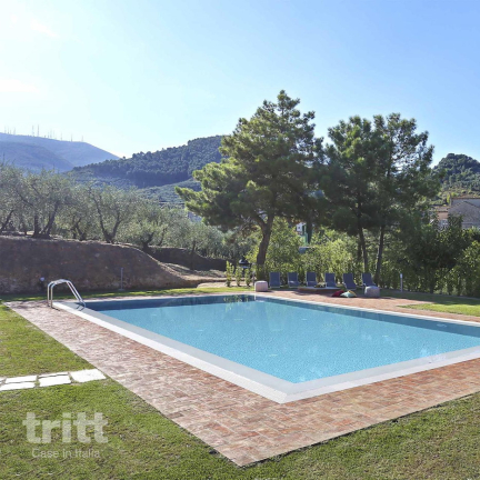 Het vakantiehuis is rustig gelegen in een heuvelachtig gebied en biedt uitzicht op olijfbomen, een dorpje en de beboste hellingen van de Compitese heuvels. Geen afgelegen setting hier, er staan andere huizen in de omgeving en het dorpje ligt vlakbij, wel zo prettig. Naast het huis staat ook een andere vakantiewoning van de eigenaar die wordt verhuurd, deze is wat groter maar ook met eigen zwembad. Op korte loopafstand ligt een klein sportcentrum met tennisbaan.
