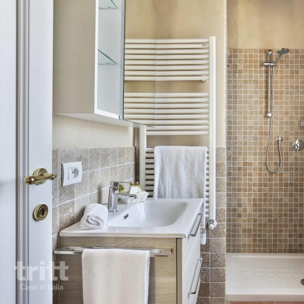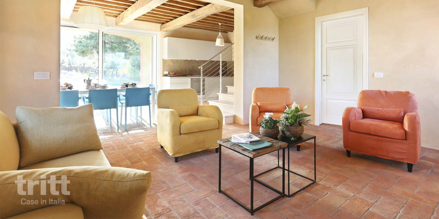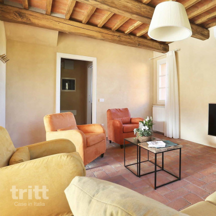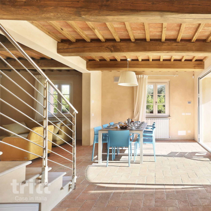 Met 6 personen kun je prima verblijven in dit vakantiehuis, er zijn 3 slaapkamers met elk een eigen badkamer en er is een extra badkamer met toilet beneden. De woonkamer heeft een comfortabele zithoek met smart tv en er is een goed ingericht open keuken. De gekozen materialen zijn typisch Toscaans zoals cotto vloeren en balkenplafonds, in combinatie met de moderne, kleurrijke inrichting zorgt dit voor een aangename sfeer. Er is een wasmachine voor de nodige wasjes en parkeren kan bij het huis. De begane grond bestaat uit een open ruimte met daarin een zithoek met satelliet tv, open keuken met modern keukenblok voorzien van 5-pits kookplaat, koelkast, vaatwasser, oven, magnetron, Nespresso machine en waterkoker, eethoek met plaats voor 8 personen, openslaande deuren naar het overkapte terras; badkamer met douche, wastafel, toilet en bidet; vanuit de woonkamer leidt een open trap naar de verdieping.