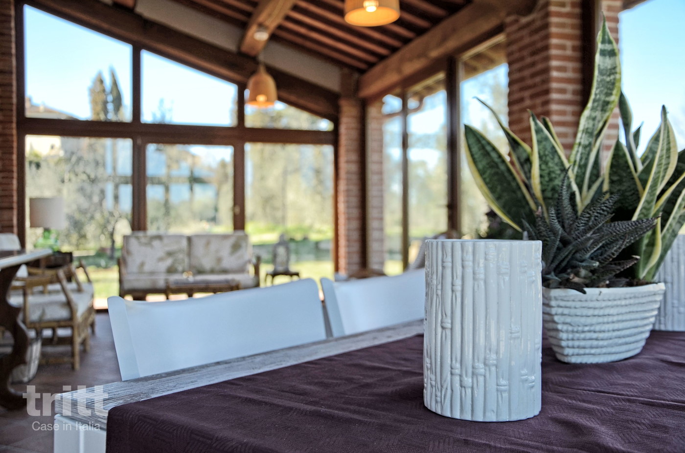 De serre woonkamer kijkt uit op het zwembad. Aan de andere kant van het huis is een overdekt terras waar ook de stenen barbecue staat.