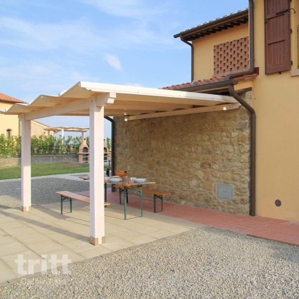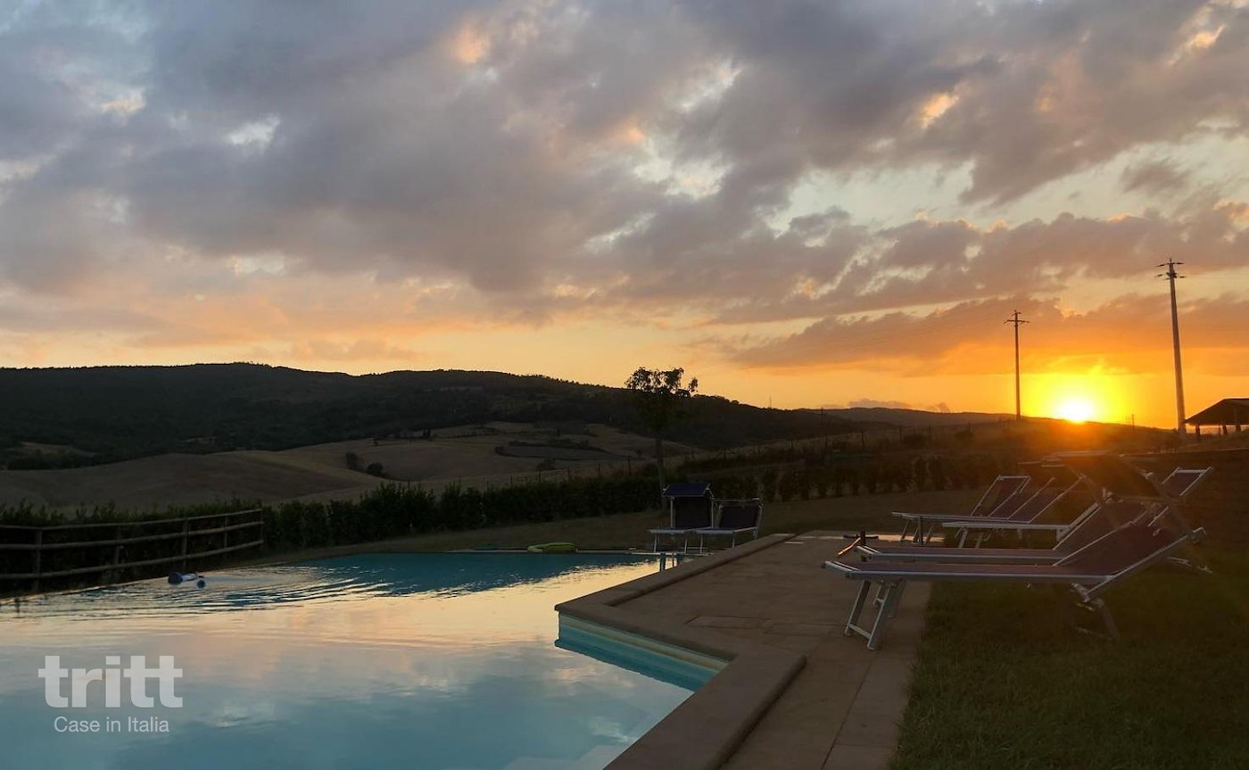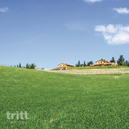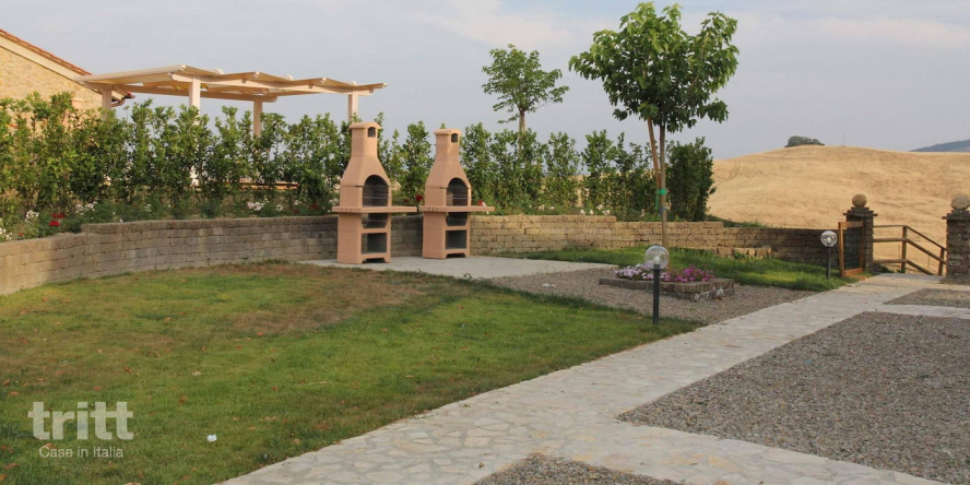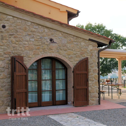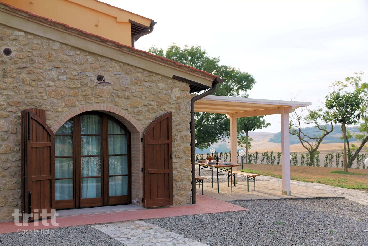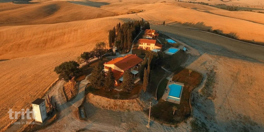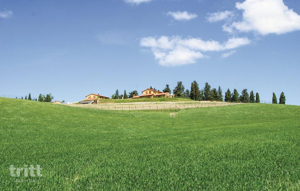 Behalve een gebouw met de 5 appartementen, staan er op het grondstuk ook 2 villas, deze kunt u hier en hier bekijken. Het geheel wordt afgesloten door een hek. Zoals u op de foto kunt zien, ligt de agriturismo heel rustig midden op het platteland van Toscane, omringd door een prachtig glooiend landschap, een auto is echter wel noodzakelijk, ook om boodschappen te doen. U bereikt de structuur via een eigen weg, onverhard.