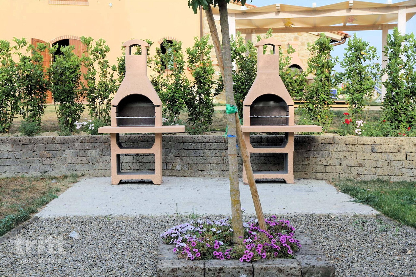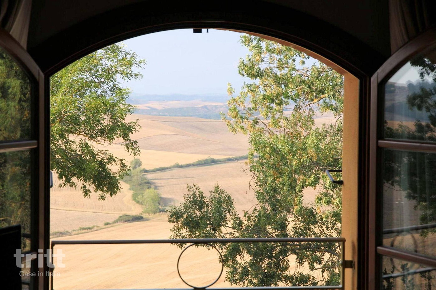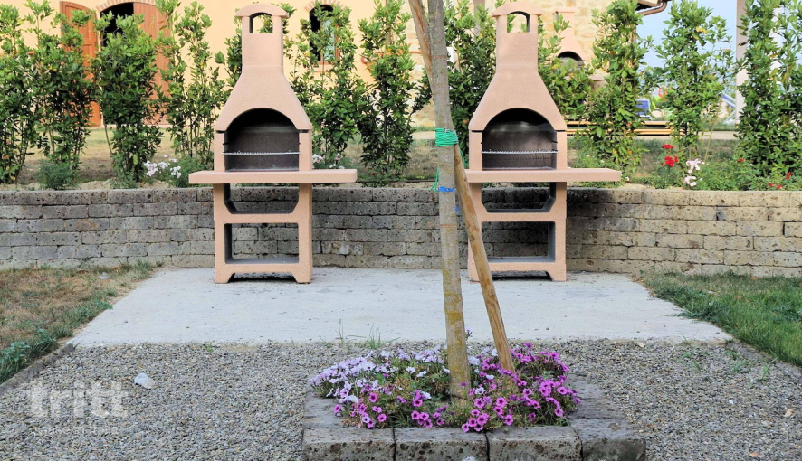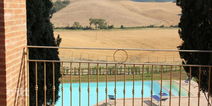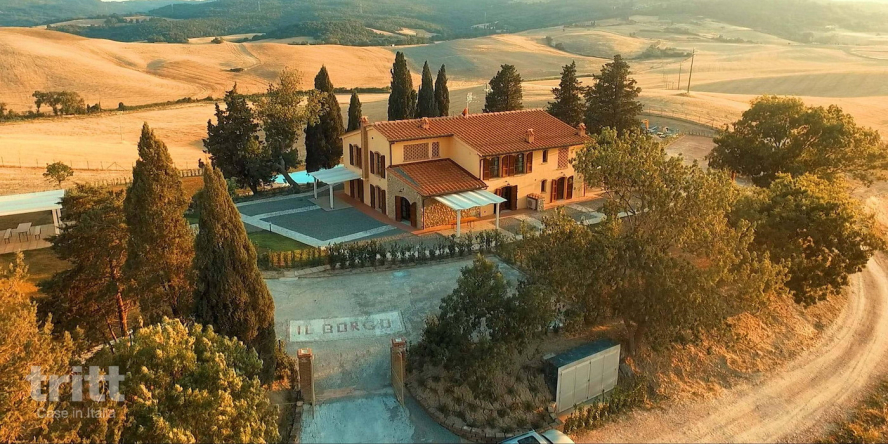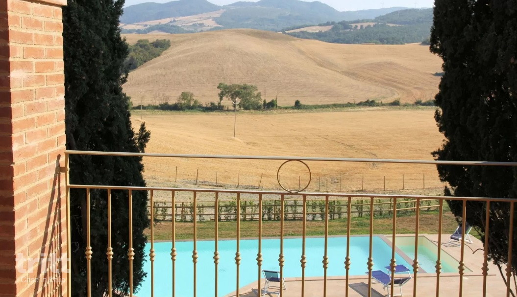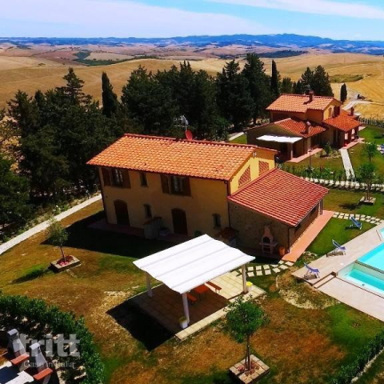 Behalve een gebouw met de 5 appartementen, staan er op het grondstuk ook 2 villas, deze kunt u hier en hier bekijken. Het geheel wordt afgesloten door een hek. Zoals u op de foto kunt zien, ligt de agriturismo heel rustig midden op het platteland van Toscane, omringd door een prachtig glooiend landschap, een auto is echter wel noodzakelijk, ook om boodschappen te doen. U bereikt de structuur via een eigen weg, onverhard.