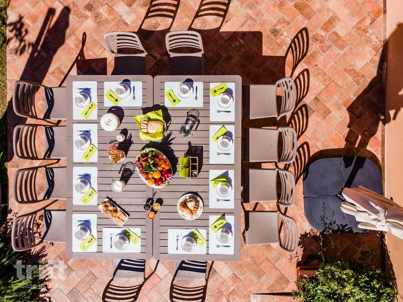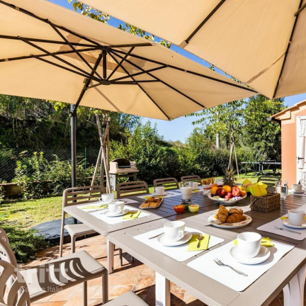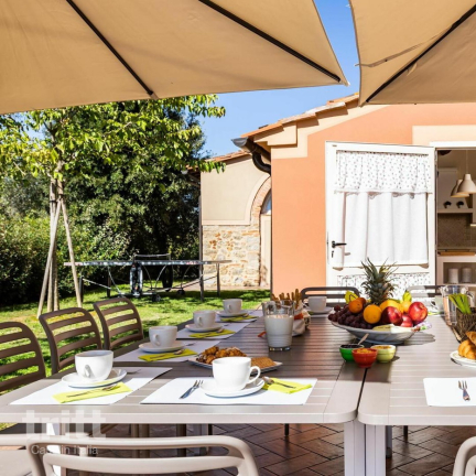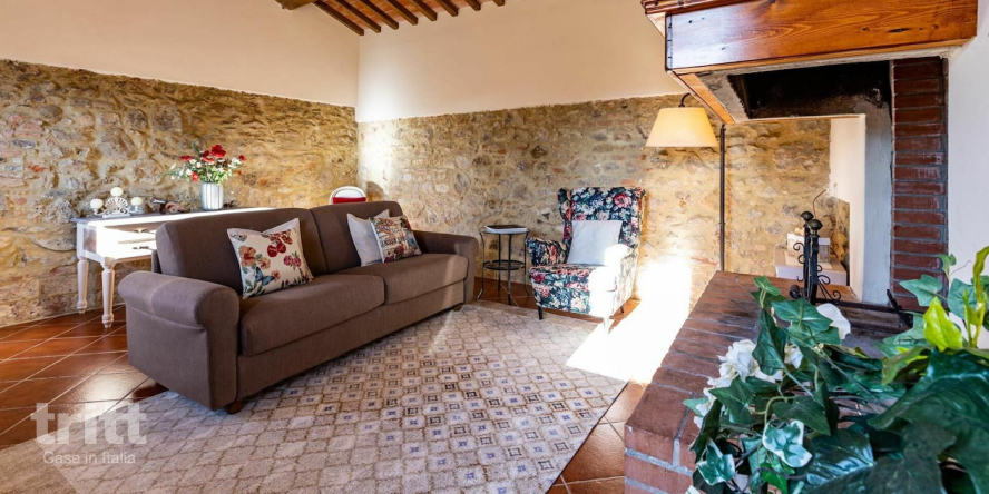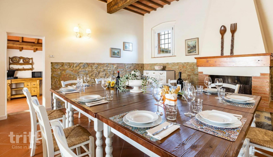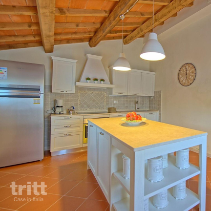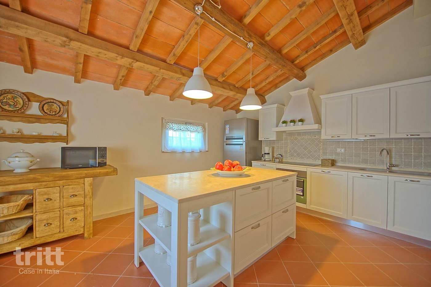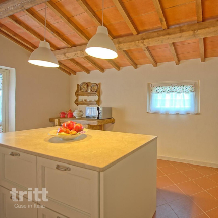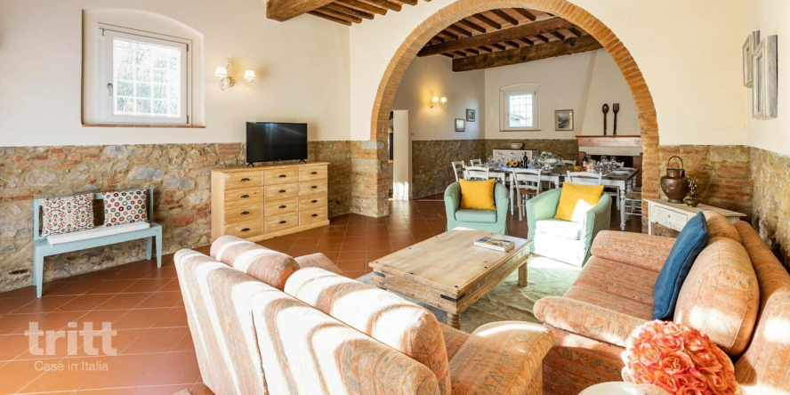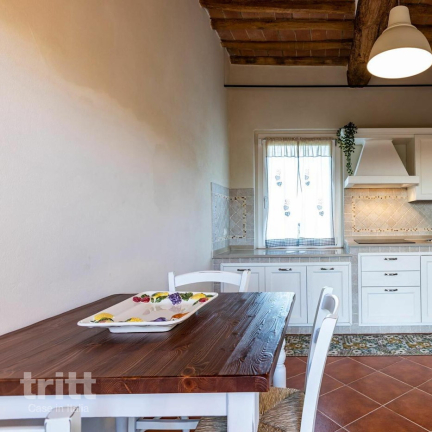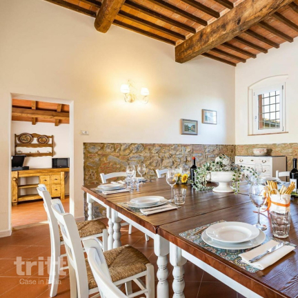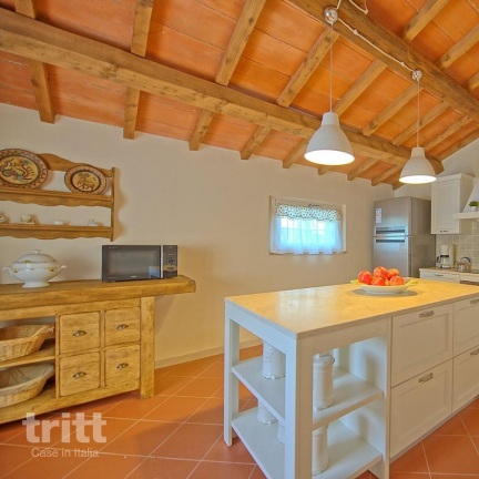 De binnenvertrekken zijn smaakvol en in Toscaanse stijl ingericht maar wel hedendaags en met moderne badkamers. Het huis straalt een gezellige sfeer uit. Het hoofdhuis heeft een grote woonkamer met zithoek, waar je met zijn allen kunt samenkomen. De ruime keuken is goed uitgerust en voorzien van oven, vaatwasser en grote koelkast. Hier kun je prima voor het hele gezelschap een maaltijd bereiden. Een wasruimte met wasmachine is aanwezig. De beide bijgebouwtjes hebben elk ook een eigen zithoekje en een badkamer met douche. Met een groot gezelschap, heb je zo toch de mogelijkheid even wat privacy op te zoeken. Alle slaapkamers zijn voorzien van airconditioning, bij de prijs inbegrepen. Het huis wordt liefdevol en goed onderhouden door de sympathieke eigenaren.
