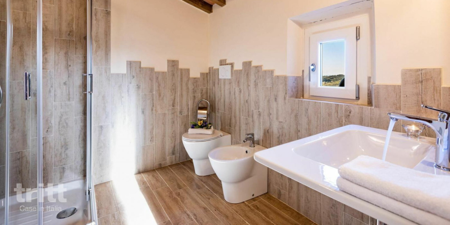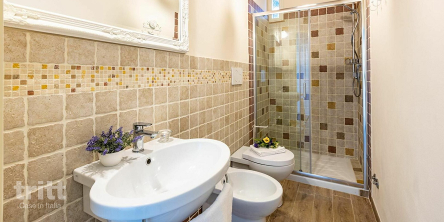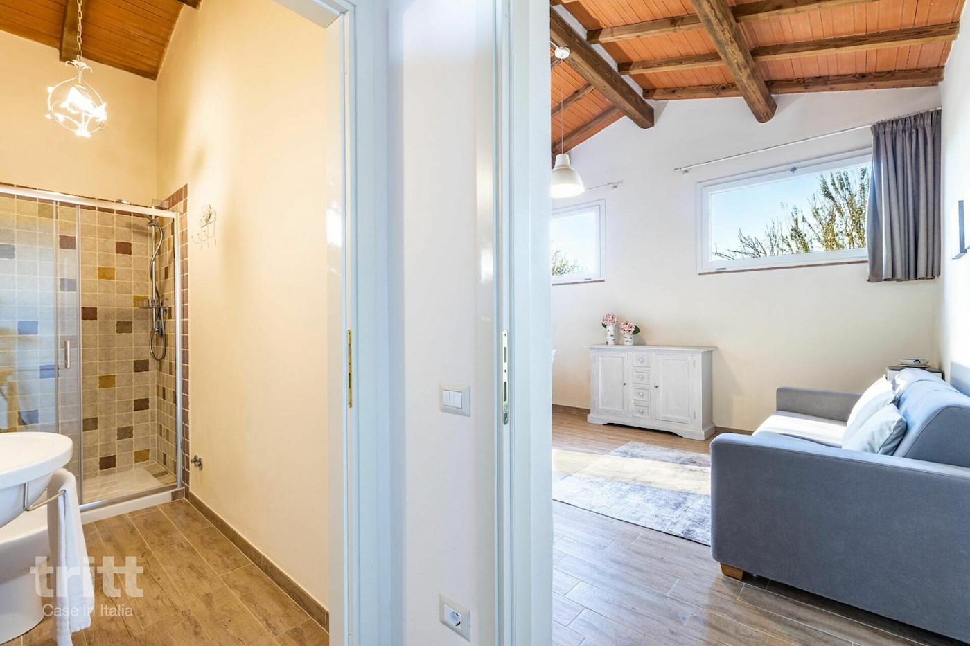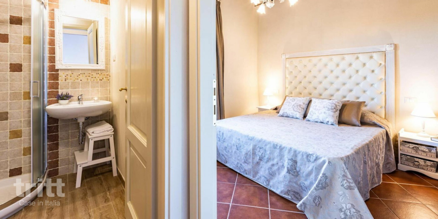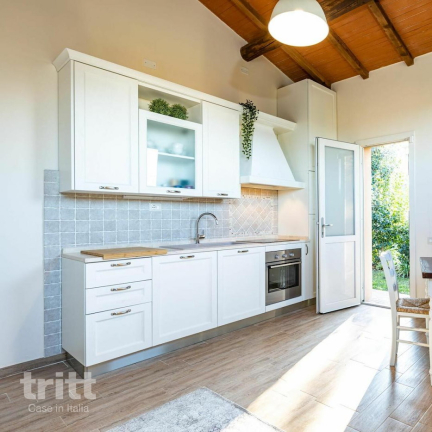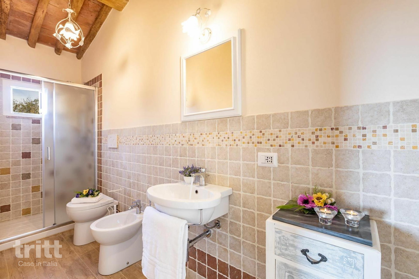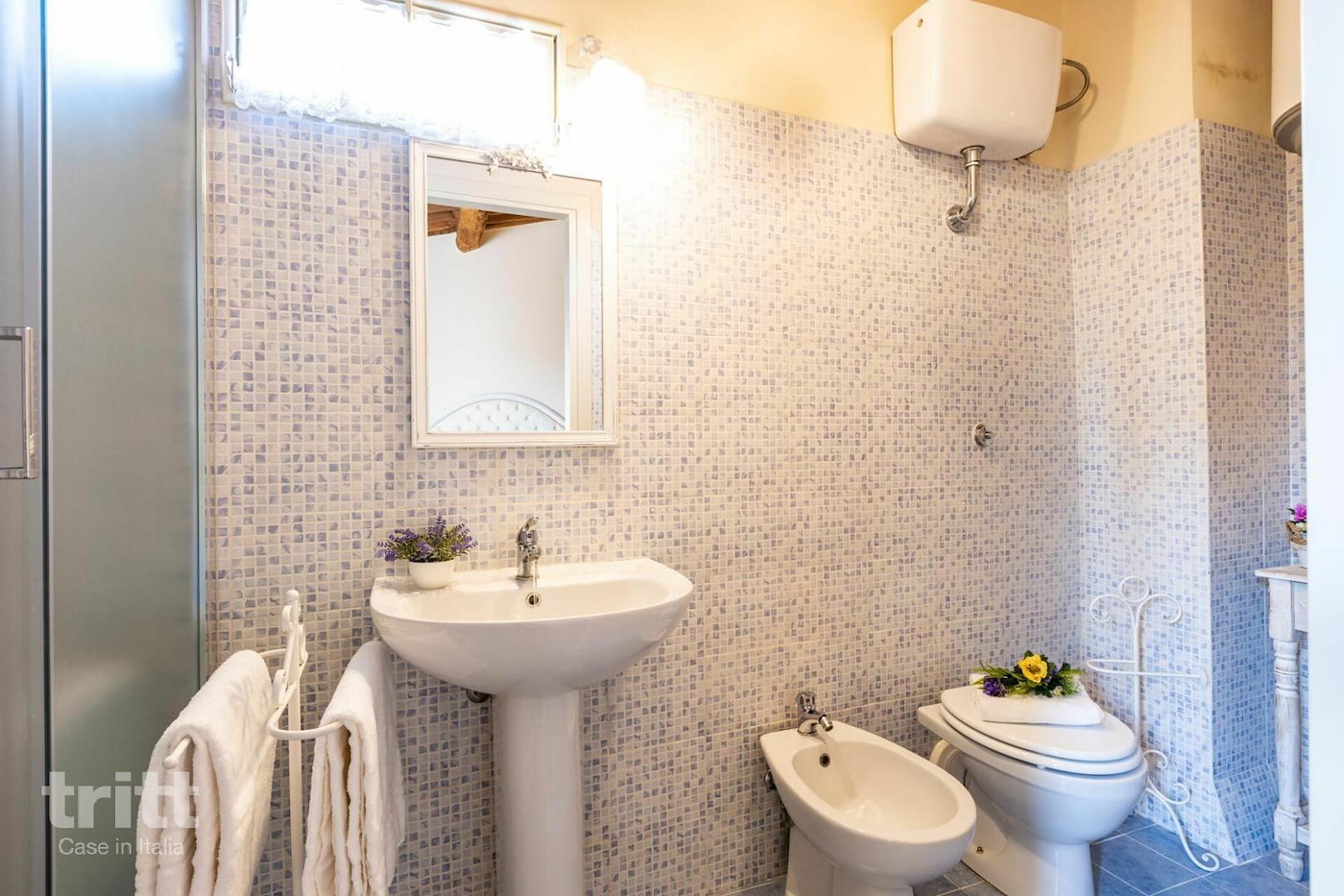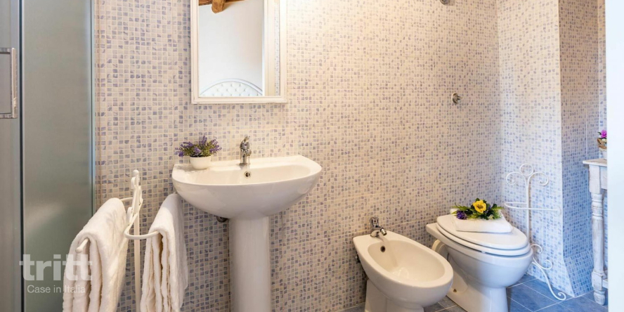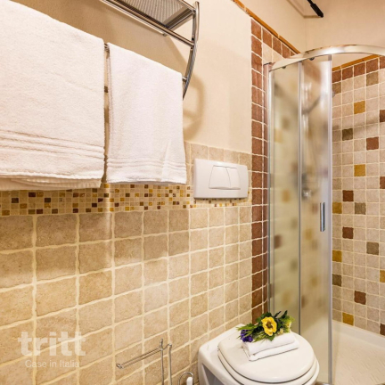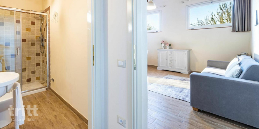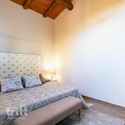 CIN: IT050025B55OJWFJBQ Hoofdhuis (300m2) – Begane grond: Grote woonkamer met tv, eethoek en open haard, doorgang naar de keuken voorzien van inductiekookplaat, oven, koelkast, magnetron en vaatwasser, vanuit de keuken een deur naar buiten; bijkeuken met wasmachine; tweede zitruimte met open haard en tweepersoonsslaapbank; extra badkamer met toilet; slaapkamer met tweepersoonsbed, airco en eigen badkamer met douche, wastafel en toilet.
