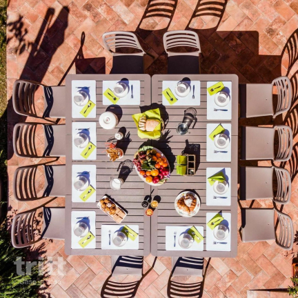In de grote tuin, op ca. 100m van het hoofdhuis ligt het zwembad met groot zonneterras, buitendouche en voldoende ligbedden en ligstoelen. Het zwembad meet 18 x 6 m en de diepte verloopt van 0,70m tot 1,20m tot 1,80m op het diepste punt. Op het betegelde terras bij het huis is een grote tafel met stoelen beschikbaar waar je met z’n allen kunt eten of borrelen.