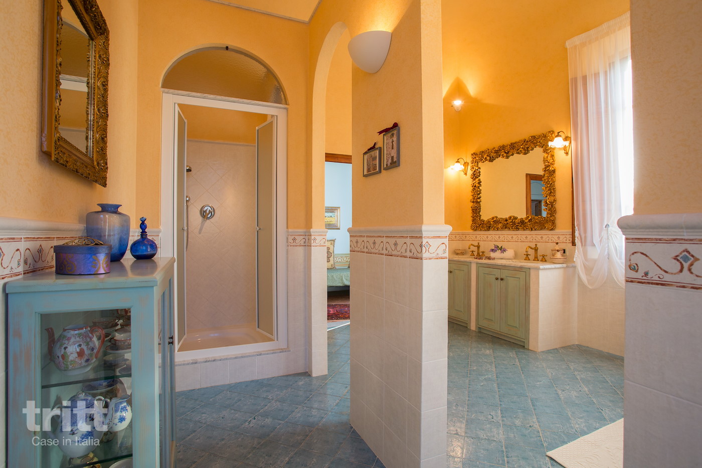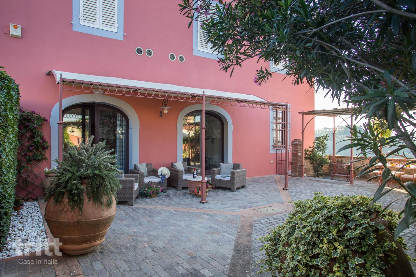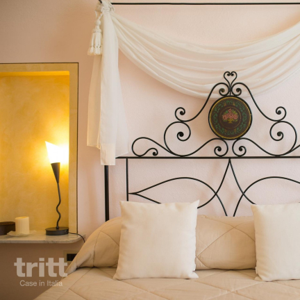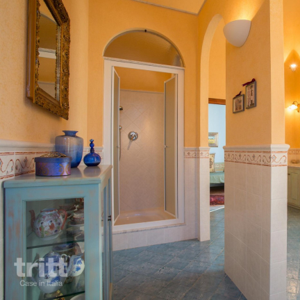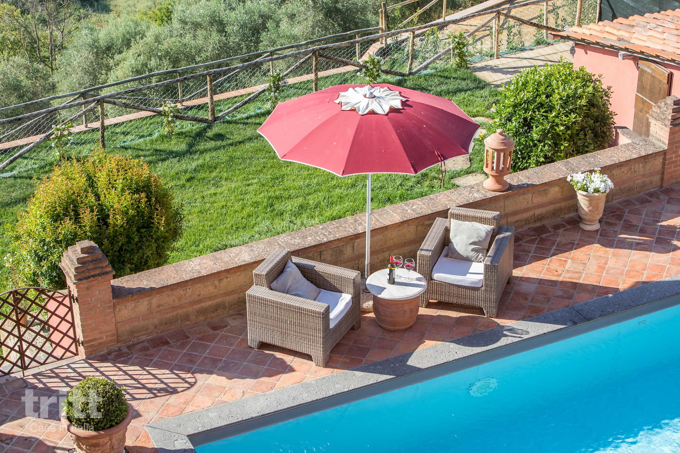 CIN: IT050025B5N7EMWHB6 (10+3 pers.) Voordeur aan de kant van het dorp. Via het hek bereikt men de parkeerplaats, speeltuin en achtertuin met zwembad (12 x 4 x 1,40), zonneterras, loungeterras en verhoogd dinerterras met lange tafel. Vanuit de achtertuin wordt de achterdeur met een stenen trapje bereikt.