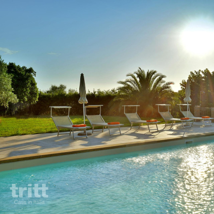 Het huis wordt omringd door een grote, niet omheinde tuin. De toegangsweg wordt afgesloten met een electronisch toegangshek (waarvoor een code wordt verstrekt). In de tuin ligt het zwembad (14×7 m, diepte 1,40 m, geopend van half mei tot eind sept), omheind en met 2 toegangshekjes. Het zwembadwater wordt gereinigd o.b.v. ozon. Dit betekent chloorvrij zwemmen, goed voor de huid en het milieu. Rondom het zwembad ligt een terras met ligstoelen, ligbedden en parasols.