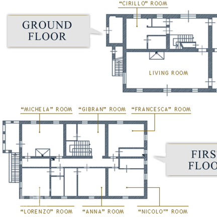 Verdieping: 6 Slaapkamers, waarvan 3 met 2 eenpersoonsbedden en 4 met tweepersoonsbed (1x honeymoonsuite met romantische openhaard; Alle kamers hebben een eigen ensuite badkamer, 6 met douche en 1 met bad. Extra bedden zijn mogelijk tegen een toeslag.